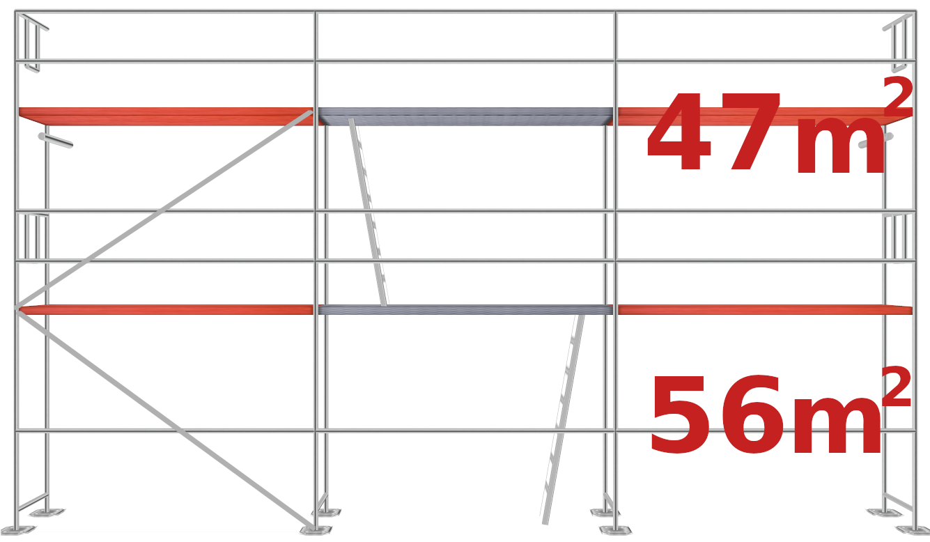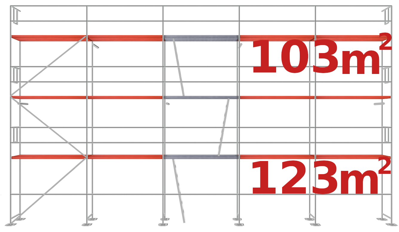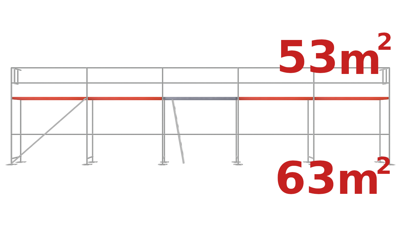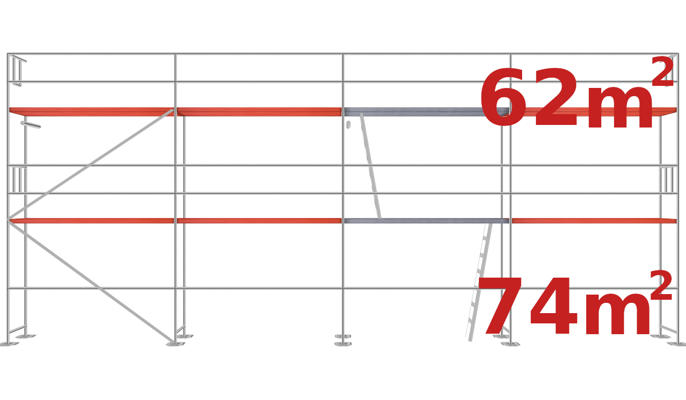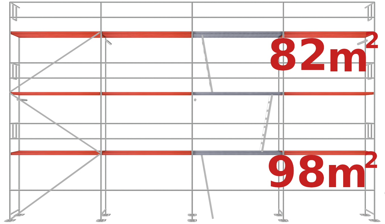 Auf unsere Website finden Sie Beispielkonfigurationen mit verschiedene Gerüstlängen von 3,0 bis 18,0 m und Arbeitshöhen von 4,2 bis 10,2 m. Die Konfigurationen haben wir mit verschiedene Feldlängen angeboten: