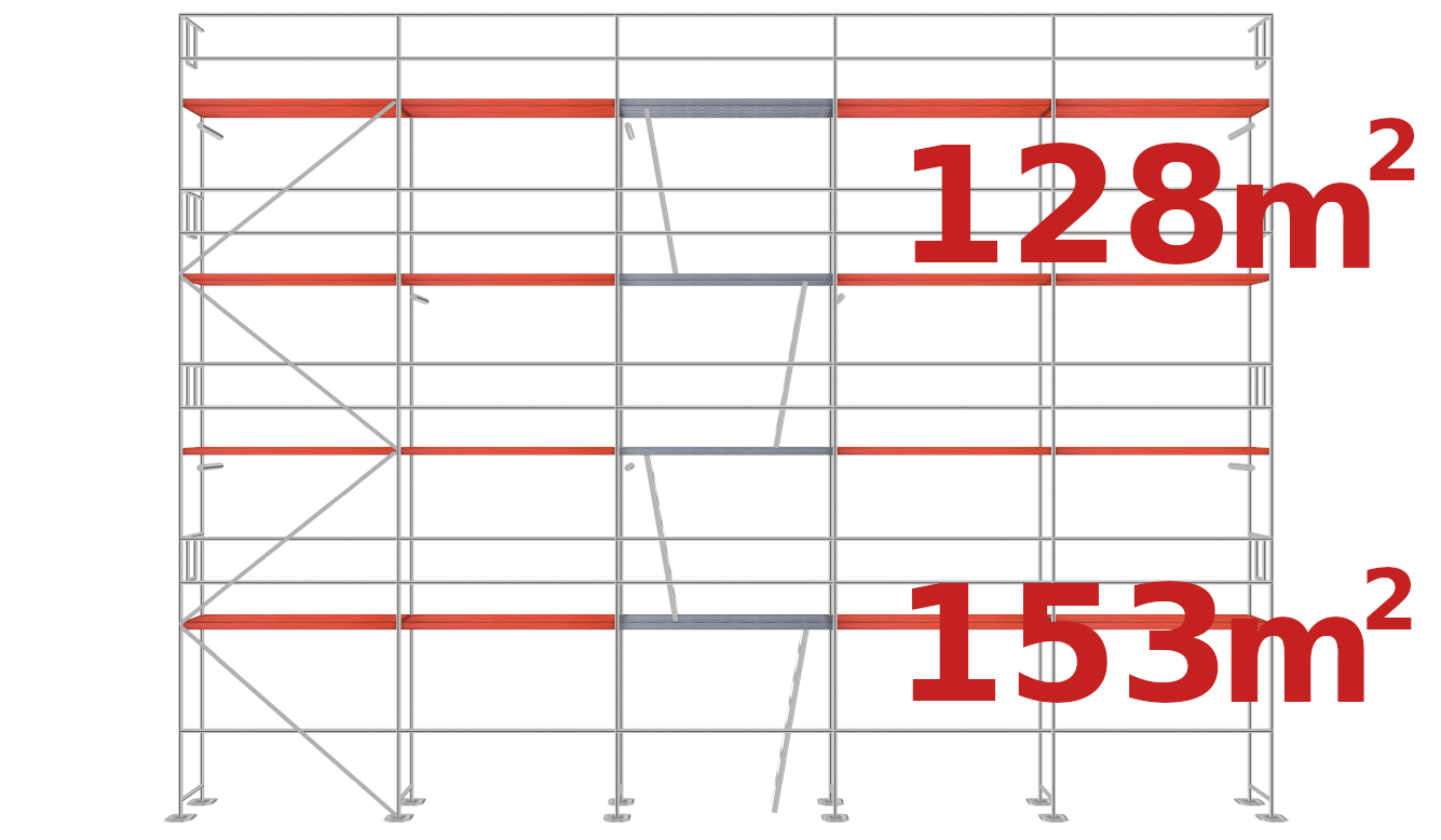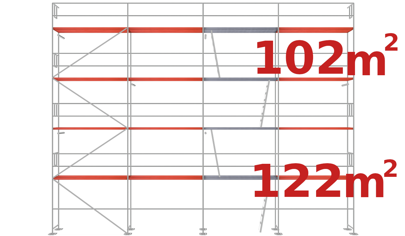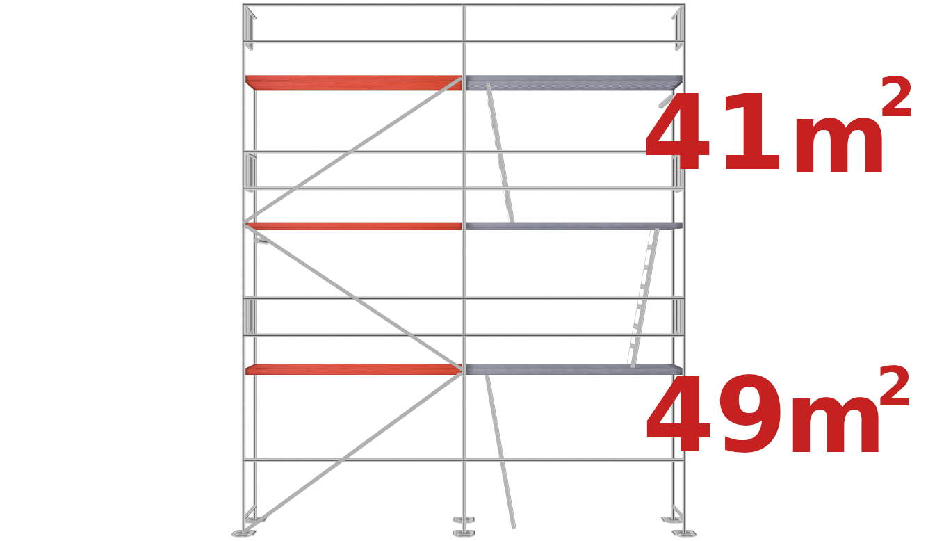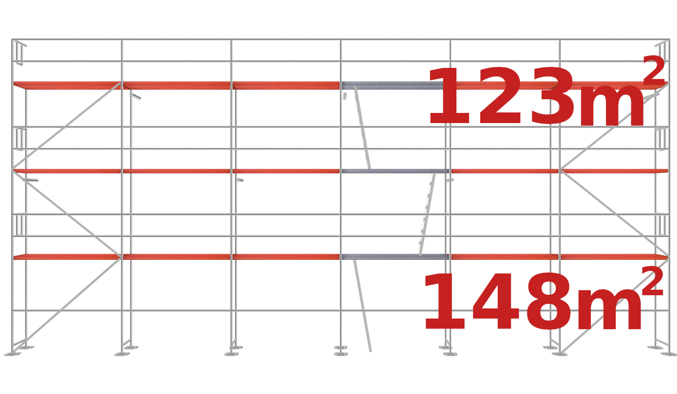 Auf unsere Website finden Sie Beispielkonfigurationen mit verschiedene Gerüstlängen von 3,0 bis 18,0 m und Arbeitshöhen von 4,2 bis 10,2 m. Die Konfigurationen haben wir mit verschiedene Feldlängen angeboten: