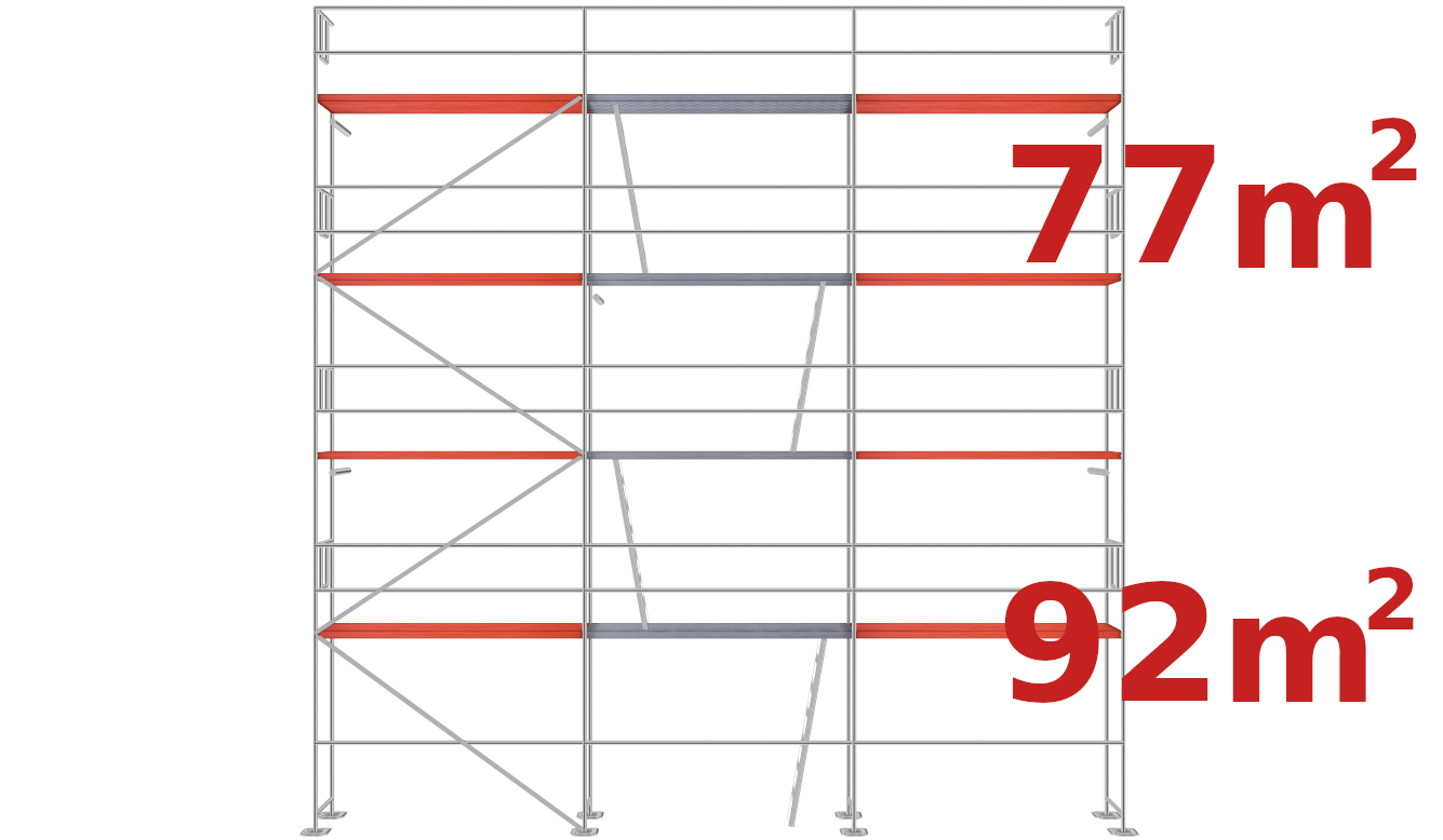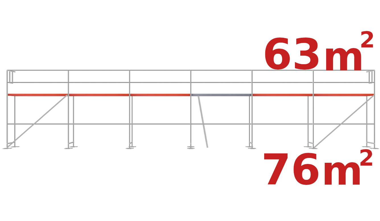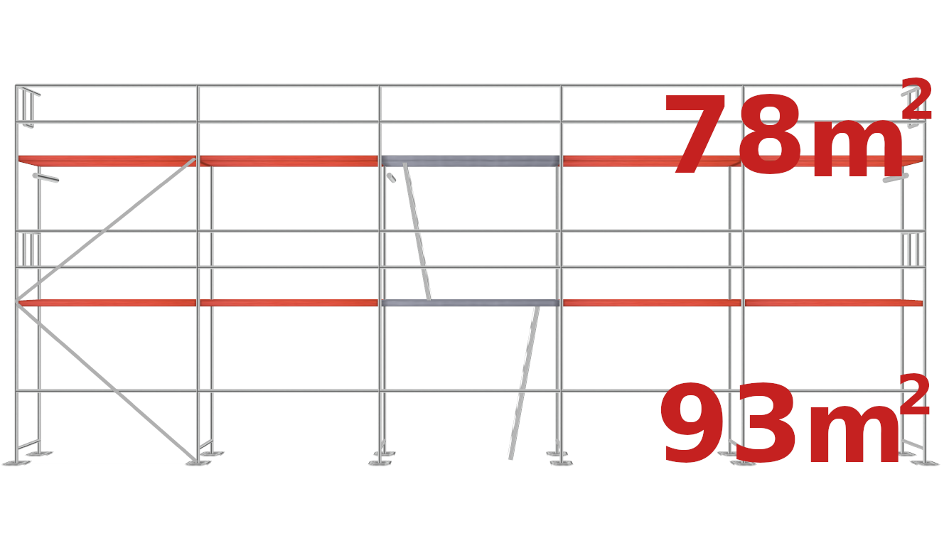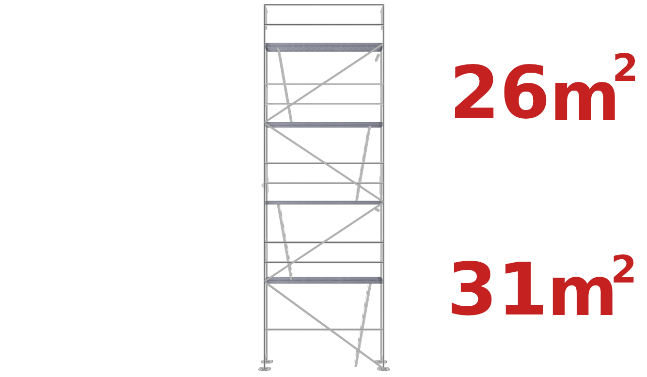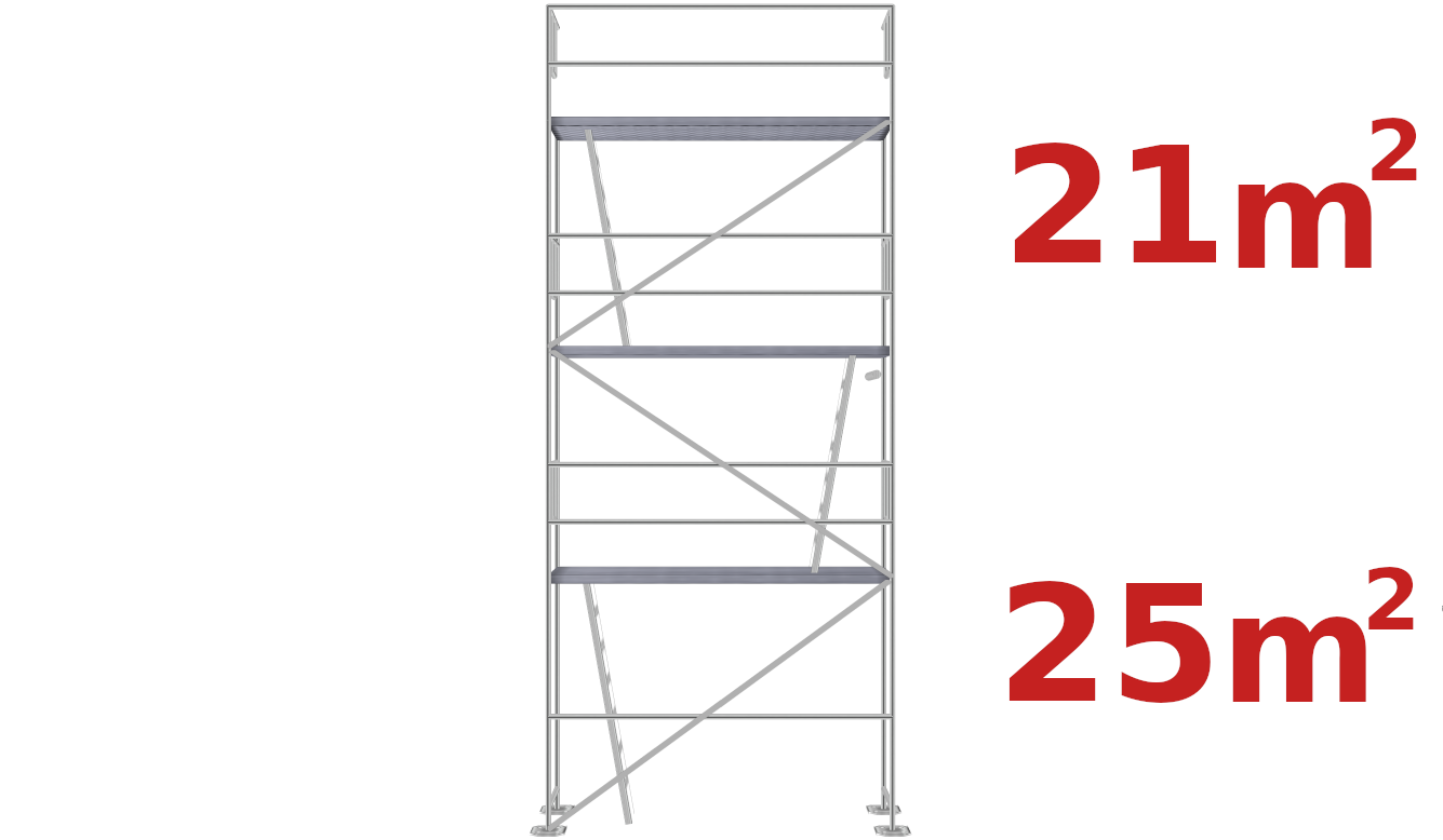 Auf unsere Website finden Sie Beispielkonfigurationen mit verschiedene Gerüstlängen von 3,0 bis 18,0 m und Arbeitshöhen von 4,2 bis 10,2 m. Die Konfigurationen haben wir mit verschiedene Feldlängen angeboten: