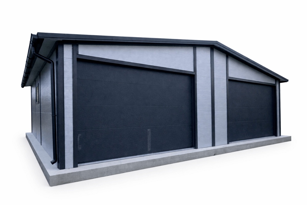 Blechgarage Halle mit Isolation, Attika, 1x Tür , 3x Fenster, 2x Sektionaltor, Kantenschutz, Verankerung, Dachrinne, Lager | inkl. Aufbau