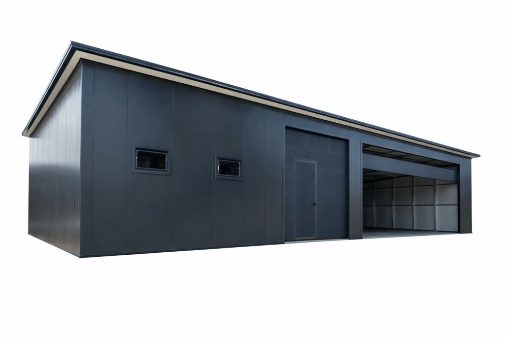 Blechgarage Halle mit einer Dachneigung nach hinten, in Farbe Konstruktion aus verzinkten Vierkantprofilen, 3x Fenster, 2x Sektionaltor (inkl. Elektroantrieb), 1x Schlupftür für Sektionaltor, Attika (Dachblende), Isolation