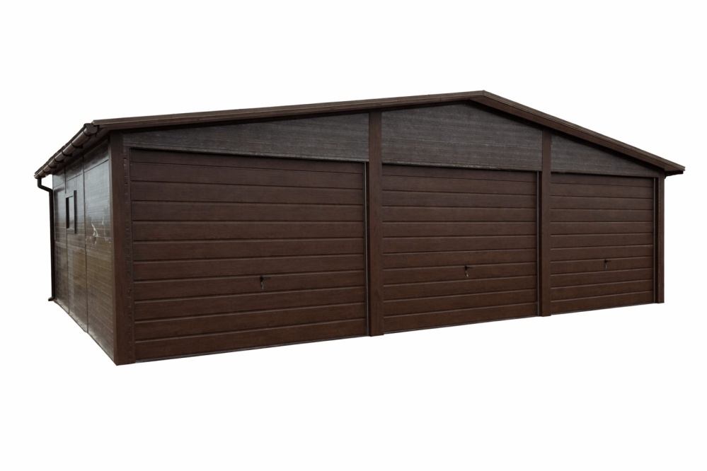 Garage 9,00 m x 5,00 m x 3,20 m mit einem Satteldach, Konstruktion aus verzinkten Vierkantprofilen, 3x Schwingtor : 2,80m x 2,20m, Nussbaum 1x Tür (Türöffnung nach links): 0,90m x 1,90m, Nussbaum 4x Fenster 1,00x0,60m Holzoptik (Wände: Nussbaum, Dach: Nussbaum) Dachrinne Attika (Dachblende) Kantenschutz Verankerung Bleche horizontal vernietet Dachblech Ziegeloptik Isolation