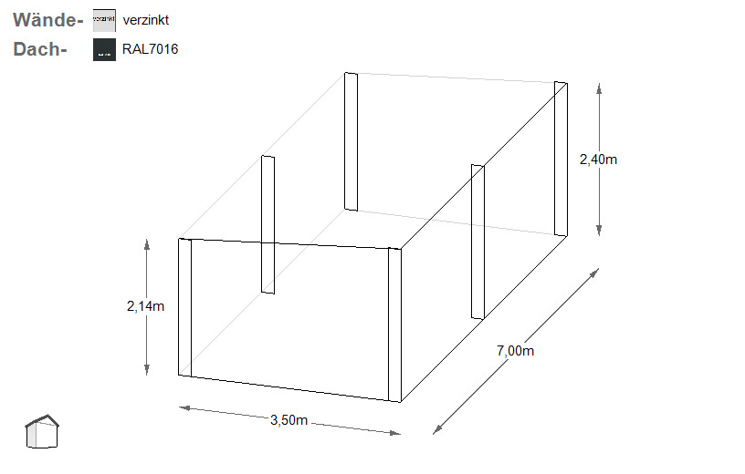 Garage Carport 3,5 m x 7,00 m x 2,4 m mit einer Dachneigung nach links, Konstruktion aus grudnierten Vierkantprofilen 10x10cm, Attika (Dachblende) RAL7016 Dachfarbe RAL7016