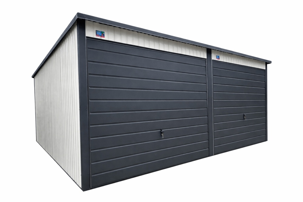 Blechgarage mit Dachneigung nach hinten, 2x Schwingtor Horizontalpanel, 2x Elektroantrieb, Dachrinne, Kondensvlies (Dach&Wände), Attika, Kantenschutz, Konstruktion aus verzinkten Vierkantprofilen, in Farbe*
