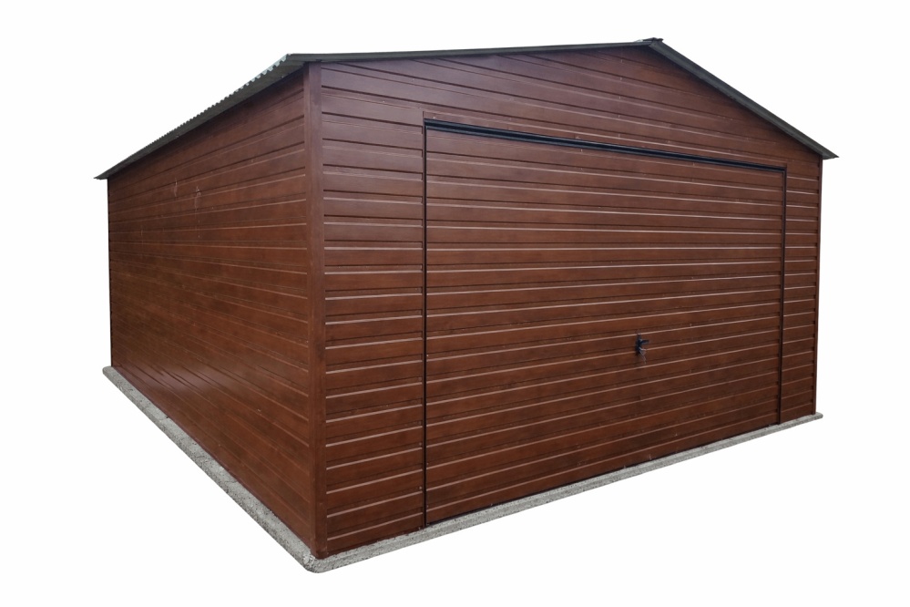 Blechgarage mit einem Satteldach, Schwingtor (Horizontalpanel 1S), Kantenschutz, in Holzdekofarbe Eine Blechgarage in Holzoptik 4x6 m ist ein Angebot von Piemar für alle, die Wert auf elegantes Erscheinungsbild ihres Grundstücks legen. Holzähnliche Beschichtung verleiht der Konstruktion ein natürliches, warmes Aussehen. Es wird perfekt mit der Pflanzenwelt des Gartens, einem Holzzaun oder architektonischen Details harmonieren. Dadurch wird die Garage nicht nur eine Schutzfunktion erfüllen, sondern gleichzeitig zu einem visuell ansprechenden Element der umgebenden Landschaft werden.